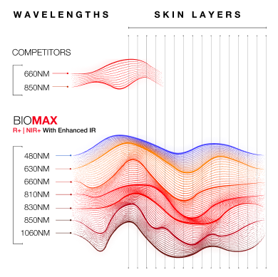 All BIOMAX lights feature the unique ability to independently digitally control the output intensity of the R+ (red) array and the NIR+ (NIR) array by dimming them from 0% - 100%. The R+ array contains the 630nm and 660nm wavelengths while the NIR+ contains the 810nm, 830nm, 850nm and 1060nm wavelengths. The blue/480nm LEDs are separately controlled on their own and they can be deactivated if you wish without affecting the rest of the LEDs.